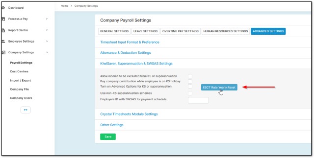 2. Navigate to “Company Settings” > “Payroll Settings” > “Advanced Settings” > “KiwiSaver, Superannuation & SWSAS Settings”.